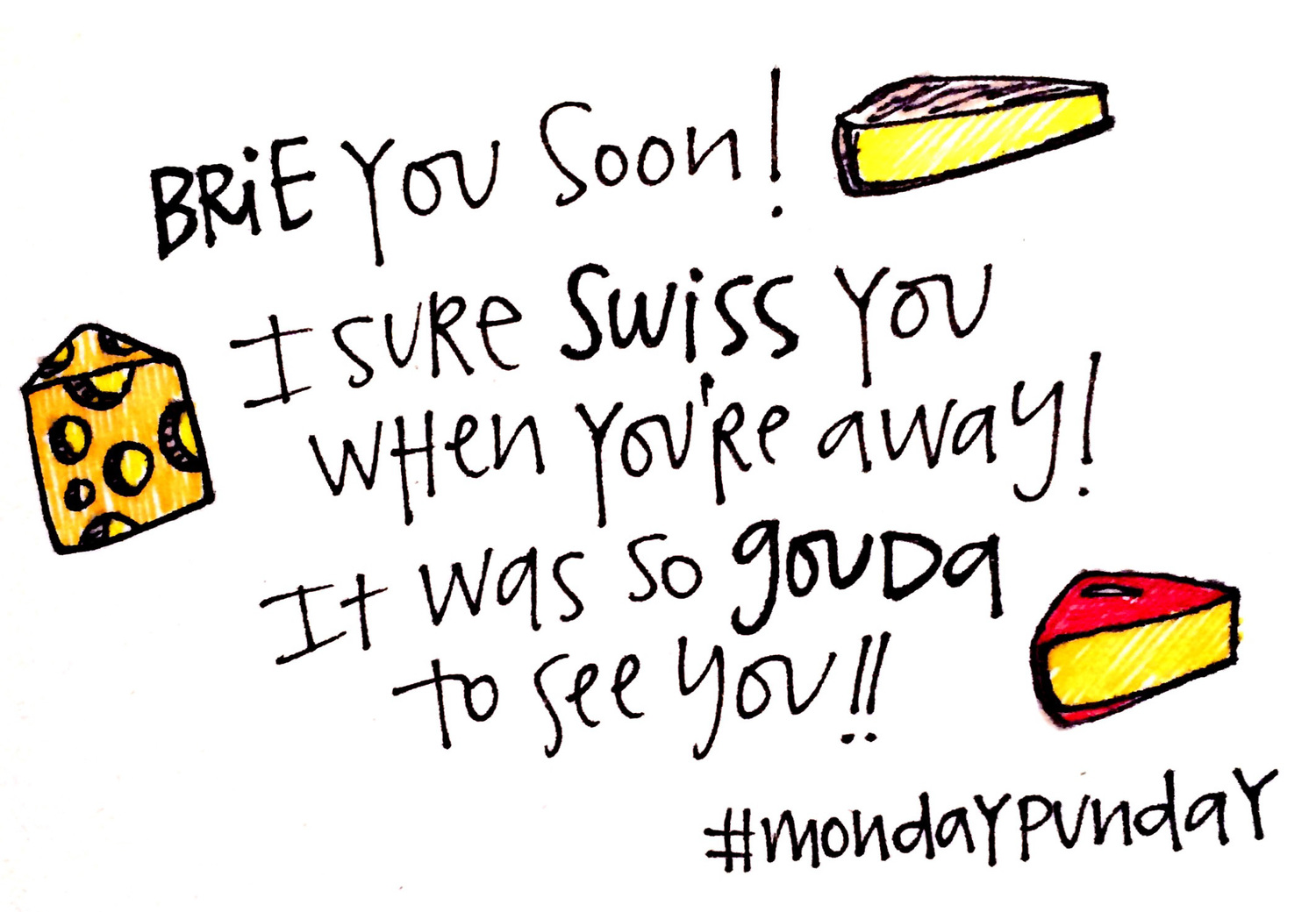 "So gouda to see you" is a pretty amateur cheese joke. I know. But then the comments happened. "Feta give credit where it is fondue?" HA. "You're also a muenster at puns?" HA.